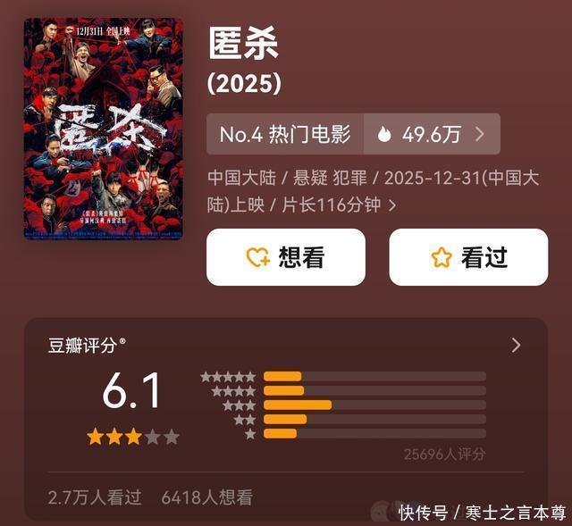 作品在情节推进方面反常理,多重复,也就导致观众形成观影疲劳,而且观众的心态也与《孤注一掷》上映时大不一样,本身就已经被各种碎片化国外事件刺激了,因此这部过于亢余不爽利的作品自然不被观众所喜。 然而就在种子选手不被看好,其他片子又较为薄弱时,柯汶利杀系列的第三部《匿杀》竟然以“血刃恶徒”“以暴制暴”的高爽度杀出重围,三天票房1.7亿,毫无疑问的元旦档国产票方冠军。